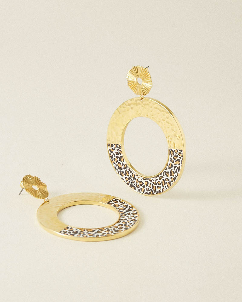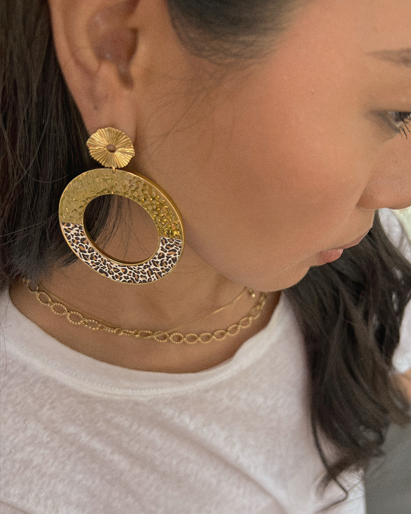 Les boucles d'oreilles Illusion avec son anneau en or martelé et sa moitié recouverte d'un morceau de cuir coloré.