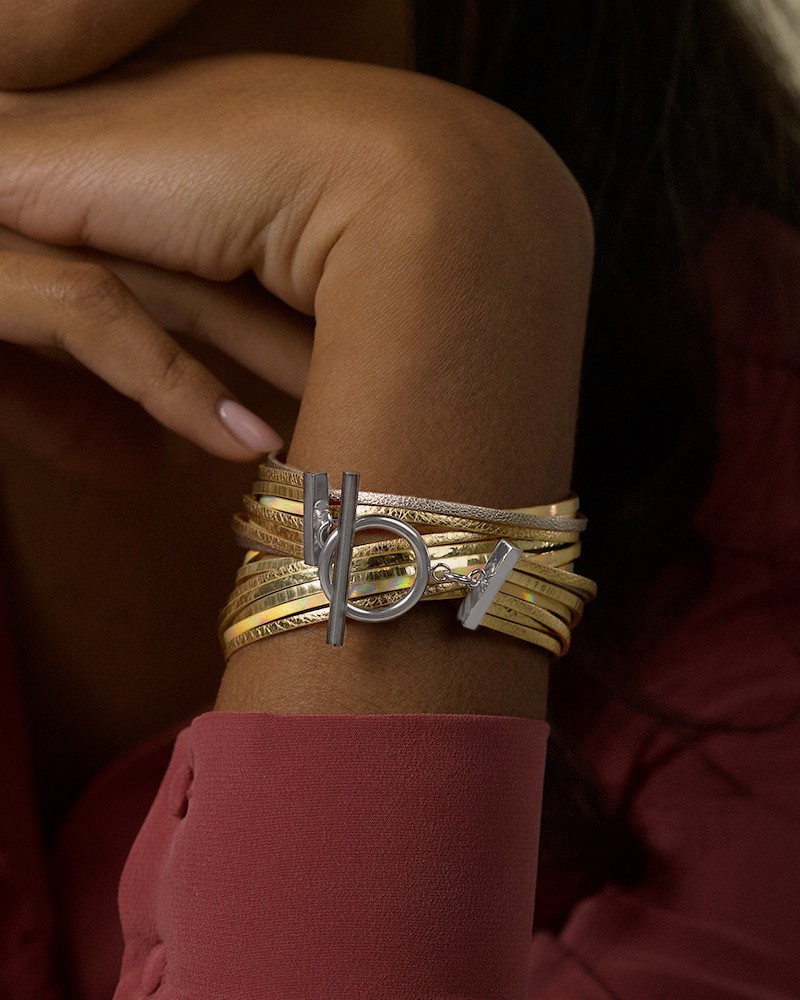 Le bracelet Starsky Mahonia s’enroule deux fois autour du poignet avec ses 12 liens en cuir, mêlant reflets dorés, textures subtiles et éclats holographiques.