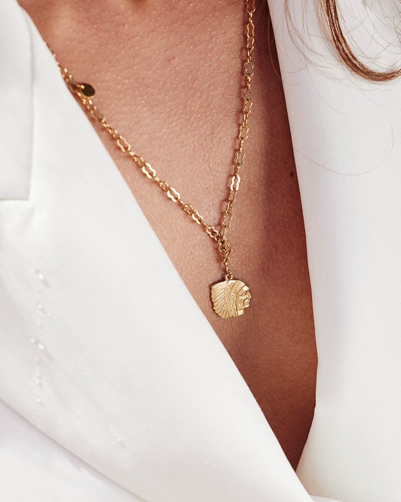 Collier Pesaro avec sa chaîne à mailles fines travaillées et son pendentif en tête d’Indien qui représente le courage et la bravoure.