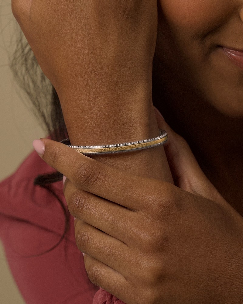 Porté seul, il révèle toute son élégance ; associé à d’autres joncs ou bracelets, il permet de jouer les contrastes et de composer un style plus affirmé.
