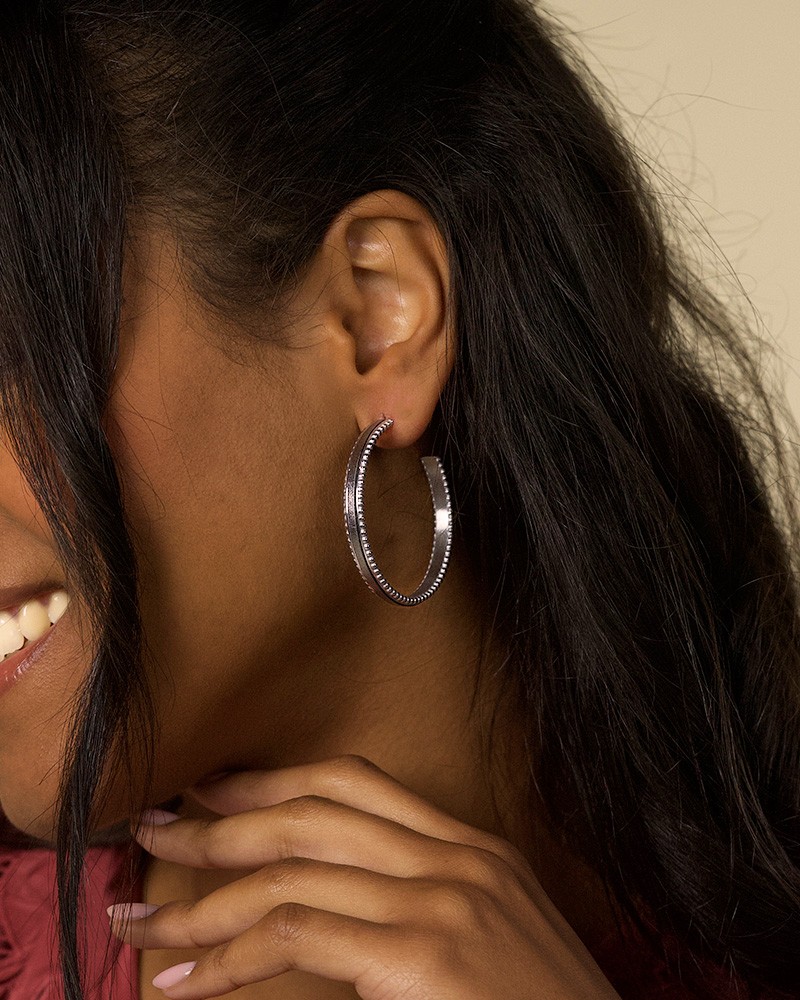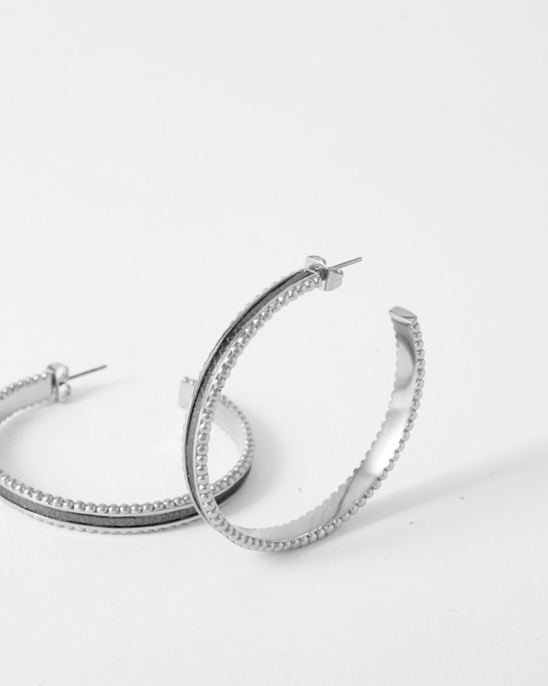 Les boucles d’oreilles Wednesday Acier mélangent cuir aux reflets métallisés et acier couleur argent.