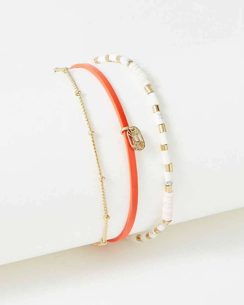 Le bracelet Appoline Orange Blood & Howlite, composé de trois liens : avec ses petites perles de nacre blanche, son lien de cuir véritable verni Orange Blood incontournable et sa chaine boules.