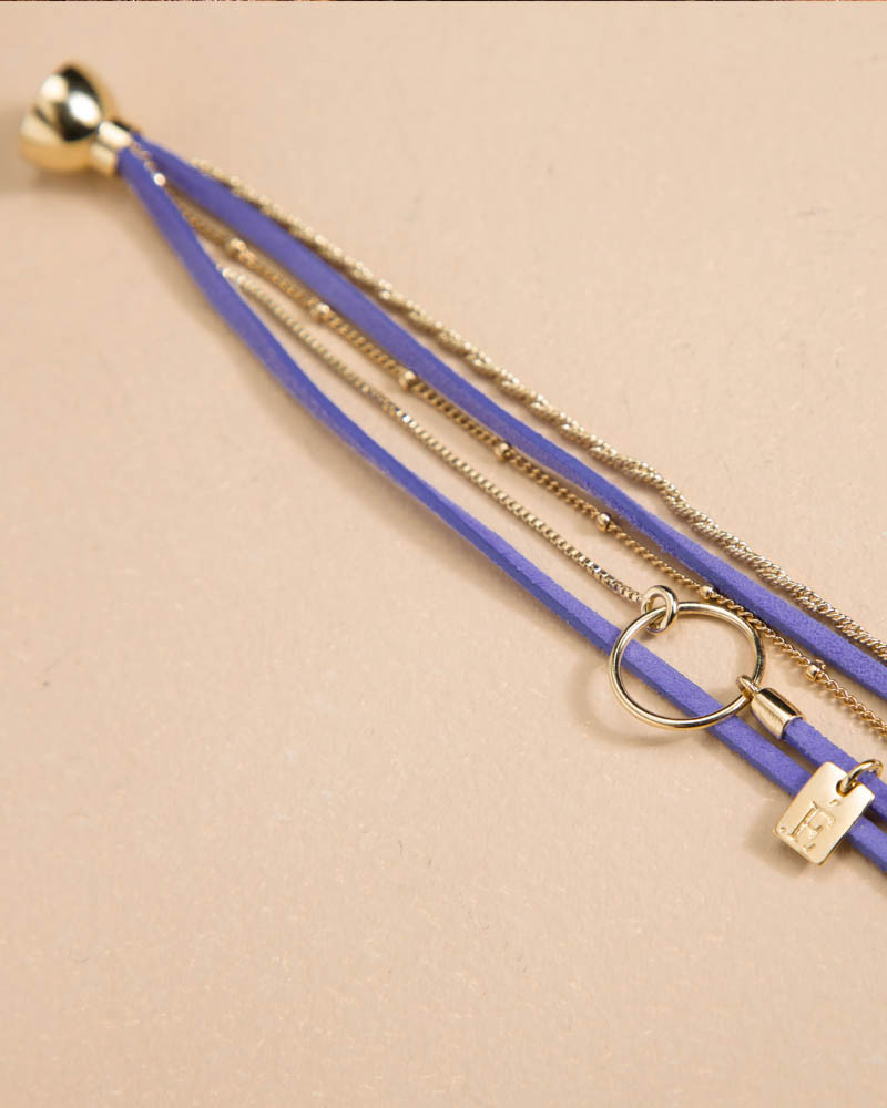 Ce modèle associe plusieurs rangs de chaînettes dorées élégantes et de liens de cuir colorés offrant un équilibre subtil entre brillance et texture.