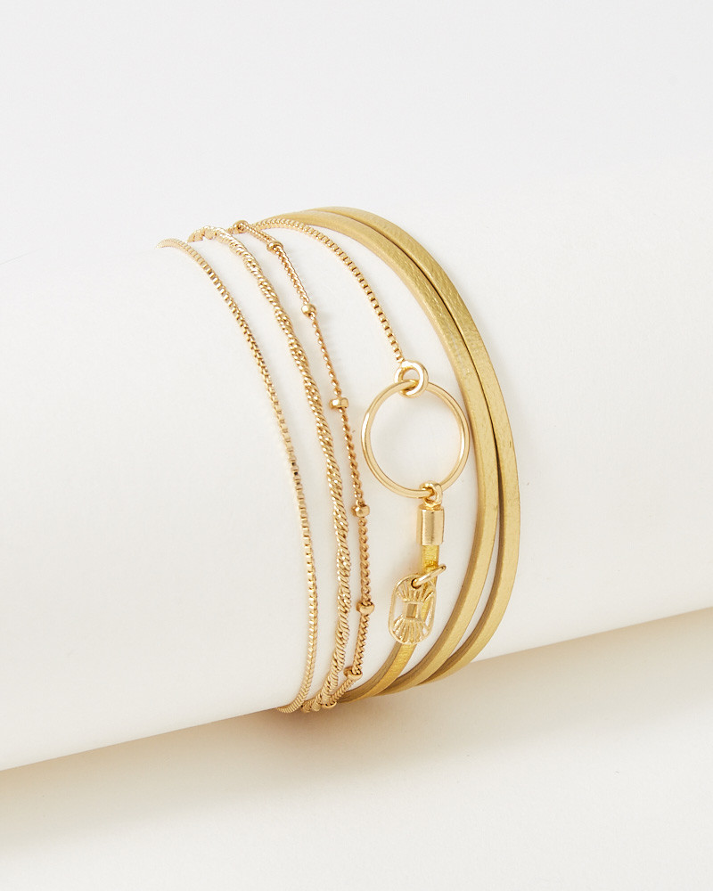 Composé de fines chaînettes dorées aux maillons variés et de liens de cuir doré métallisé, ce bijou apporte lumière et élégance au poignet.