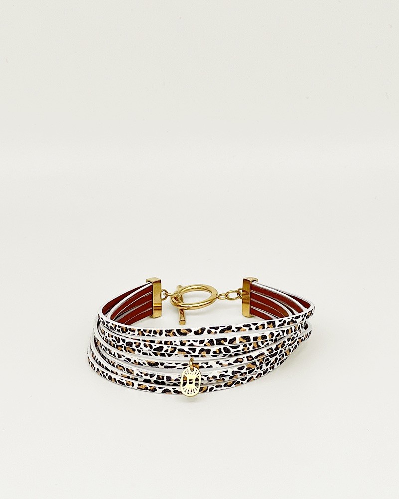 Le bracelet Huggy White Léo flowersforzoé allie l’élégance du cuir blanc avec des motifs léopard audacieux et des détails en métal doré. Son design raffiné, associé à un fermoir en T, confère à ce bracelet une touche moderne et sophistiquée. Confortable, il se porte aussi bien seul pour un look chic que combiné avec d'autres bracelets pour un style plus affirmé. Ce bracelet est une idéale idée cadeau ou un bijou incontournable pour celles qui recherchent un mélange de confort, élégance et modernité.