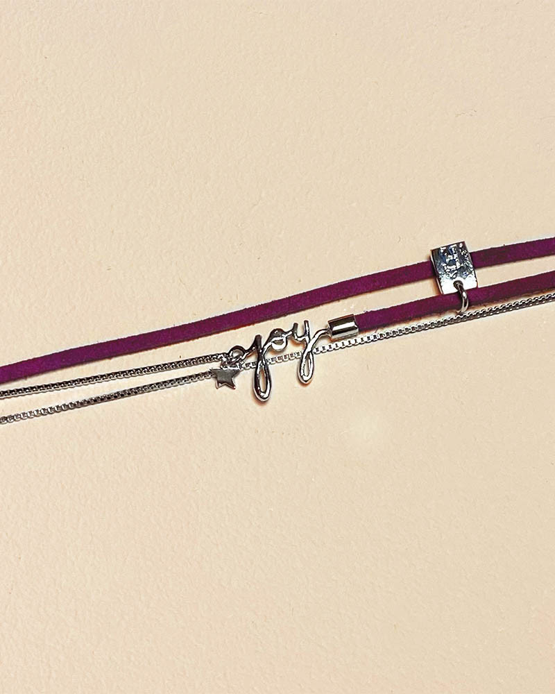 Le bracelet Joie avec son lien cuir, sa chaîne et son petit mot.