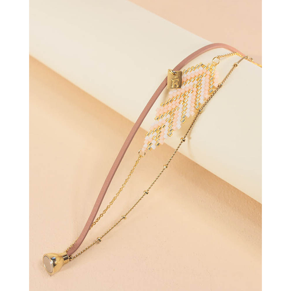 Le bracelet Philomène : l'accord parfait d'un lien de cuir, de deux chaînes en petites mailles dont l'une est dotée d'une magnifique plume de perles.