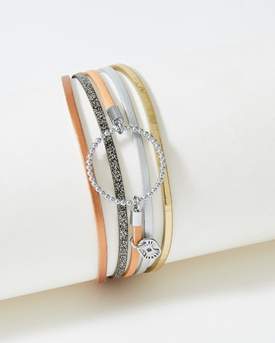 Le bracelet Téo, un mélange parfait d'un lien de cuir, d'une chaine de mailles fines et d'un anneau.