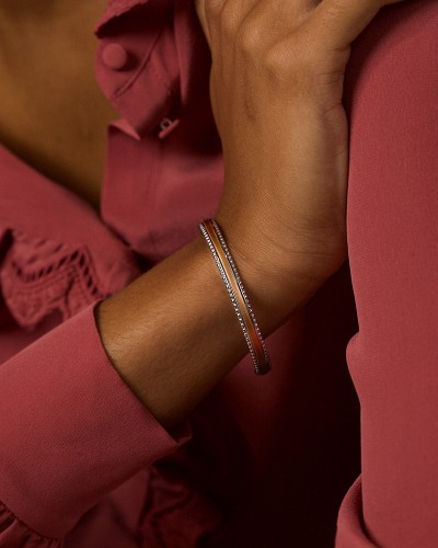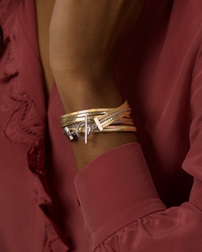 Si vous aimez les bijoux avec un mélange de matières, le bracelet Valentin est une valeur sûre : avec son cuir fin et coloré et ses mailles, le résultat est top